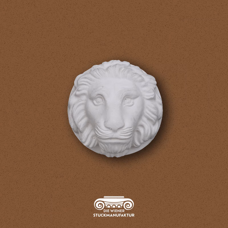 Stuck Löwenkopf d=140mm aus Gips. Dieses Produkt lässt sich hervorragend mit anderen Dekorelementen kombinieren.
