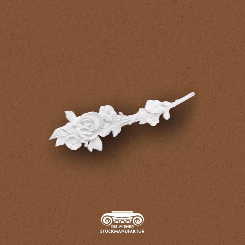 Stuck Rosengirlande Mittelteil rechts 139/440mm aus Gips. Zu diesem rechten Mittelteil der Rosengirlande, haben wir noch weitere passende Stuckelemente dieser Kombination in unserem Sortiment. Es lässt sich aber auch hervorragend mit anderen Stuck Dekorelementen kombinieren.