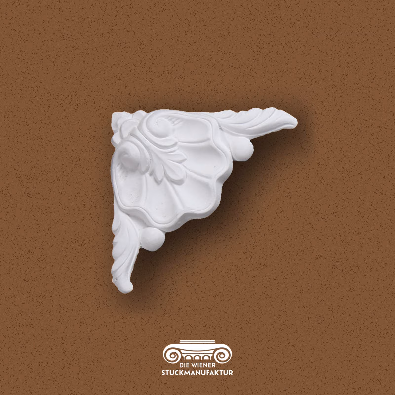 Stuck Freie Dekorecke 155/155mm aus Gips. Dieses Stuck Eckelement lässt sich hervorragend mit anderen Stuckelementen aus unserem Sortiment kombinieren.