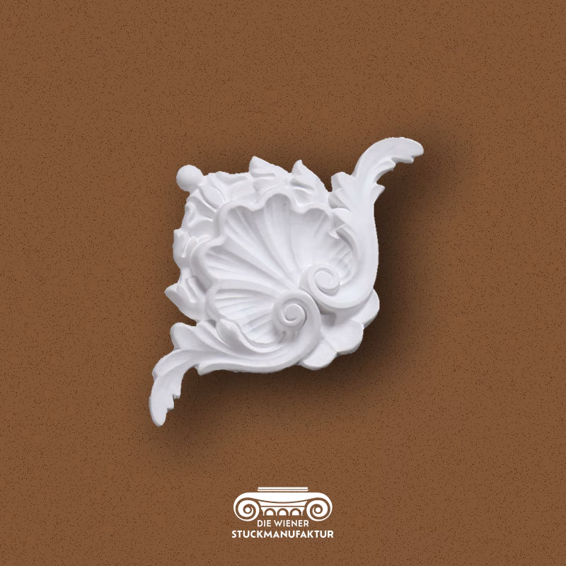 Stuck Freie Dekorecke 150/150mm aus Gips. Dieses Stuck Eckelement lässt sich hervorragend mit anderen Stuckelementen aus unserem Sortiment kombinieren.