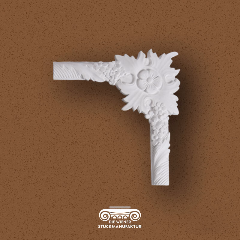 Stuck Ecke 250/235mm zu L0702 aus Gips. Zu diesem Eckelement haben wir auch die passende Leiste zur Gestaltung von Deckenspiegeln und Wandfeldern in unserem Sortiment.