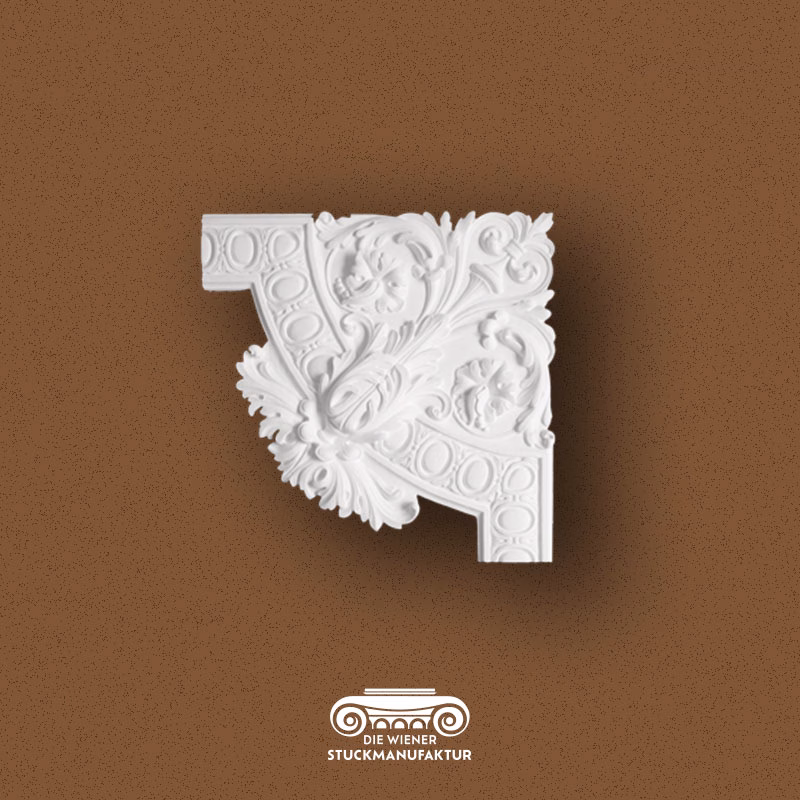 Stuck Ecke 350/350mm zu L0727 aus Gips. Zu diesem Eckelement haben wir auch die passende Leiste zur Gestaltung von Deckenspiegeln und Wandfeldern in unserem Sortiment.